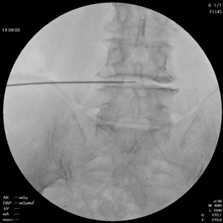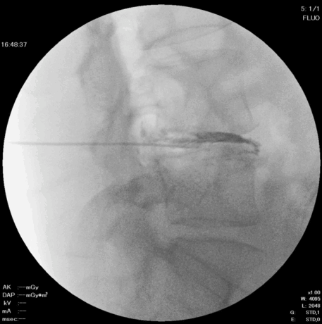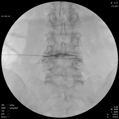 椎間板造影と同じように椎間板に穿刺し、局所麻酔を行います。