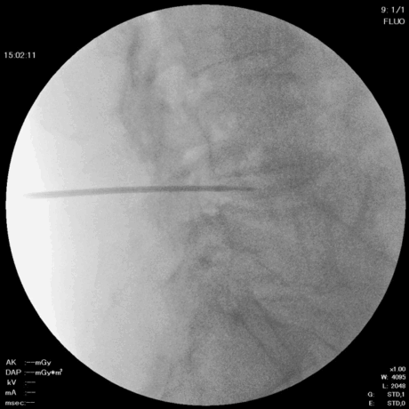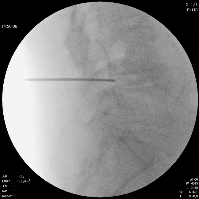 直径約2mmのニードルを椎間板に留置します。